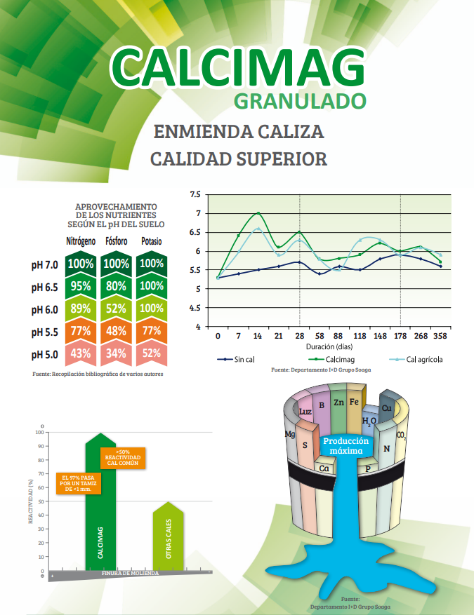Calcimag es un mejorante de suelos procedente de depósitos fósiles de algas marinas, 100% ecológico y sin aditivos. Se presenta en granulometría fina para facilitar su mezcla y reacción en el suelo; el 97% pasa por un tamiz de <1 mm. Además del calcio aporta magnesio y oligoelementos que favorecen la disponibilidad de nutrientes y el crecimiento vegetal. Su uso regular corrige la acidez, mejora la estructura del suelo y optimiza el rendimiento de los cultivos. Aplícalo en labores de reavivado o junto a la fertilizacion para mantener un pH más estable.